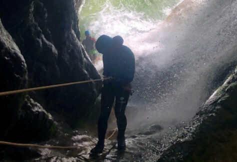 Dans le canyon du Furon Bas en Isère, nous désescaladons des blocs, passons sous des blocs (non obligatoires), descendons en rappel une cascade de tuf magnifique. Attention les yeux : nous passerons des étroitures, et également une succession de grandes et profondes vasques avec des couleurs verdoyantes.